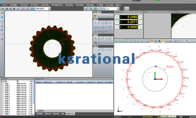 功能元素测量与预制:点、线、圆、弧、槽、椭圆、矩形、圆环、云线、距离、角度、焦面 元素构造:中心点、交点、中点、线、圆、角度、距离、云线等的构造。圆形处理:坐标平移动、工件摆正、坐标系重置、圆形缩放、圆形平移动、圆形选中及删除控制等多种处理,测量更方便快捷,提高测量效率