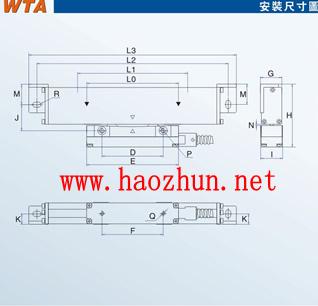 L3=L0+149(行程≤900) 尺身最大尺寸 D:60±0.1 读数头侧面安装孔距 E:90 副尺最大尺寸 F:60±0.1 读数头顶部安装孔距 G:21 尺身厚度尺寸 H:61.5 尺身最大高度 I:21±0.1 副尺体最大尺寸 J:25.5 主尺到副尺最大距离尺寸 K:10.25 主尺安装孔距 M:20 主尺安装孔距 N:1.3±0.3 读数头与主尺间隙 P:2-M5-6H 副尺安装螺孔 Q:2-M4-6H深7 底部安装螺孔尺寸 R:4-5*8腰形孔 主尺安装孔